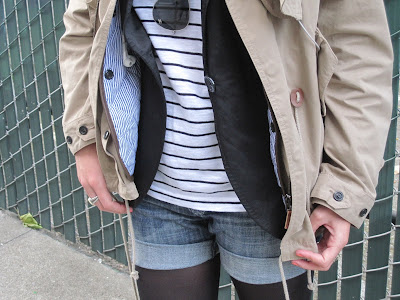Urban Explorer Tee: Old Navy. Blazer: Banana Republic Monogram. Jacket: Zara. Shorts: R&R. Boots: Hunter. Bag: Longchamp. Sunglasses: Burberry. Tights: BR. Jewelry: DY, RL, BR, Michele.