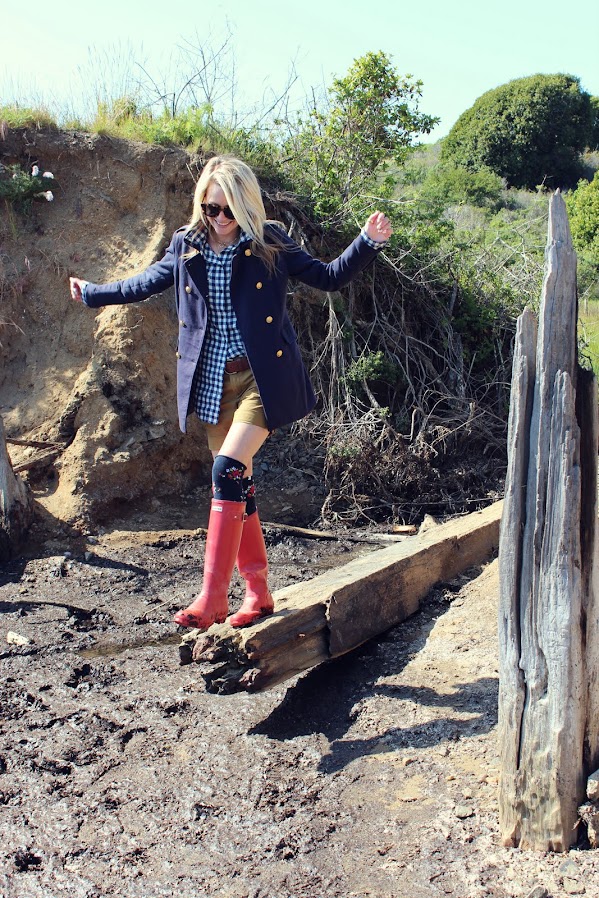 Top/shorts: Gap. Jacket: F21. Socks: Gilly Hicks. Boots: Hunter. Sunglasses: Karen Walker.